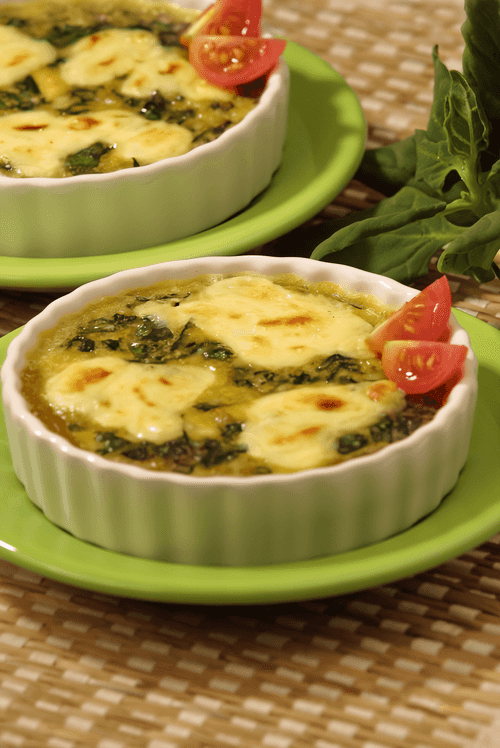 Boil the noodles in salted boiling water, drain and rinse with cold water. Then mix the noodles with spinach, add butter, flatten, and bake. Serve with cream.
