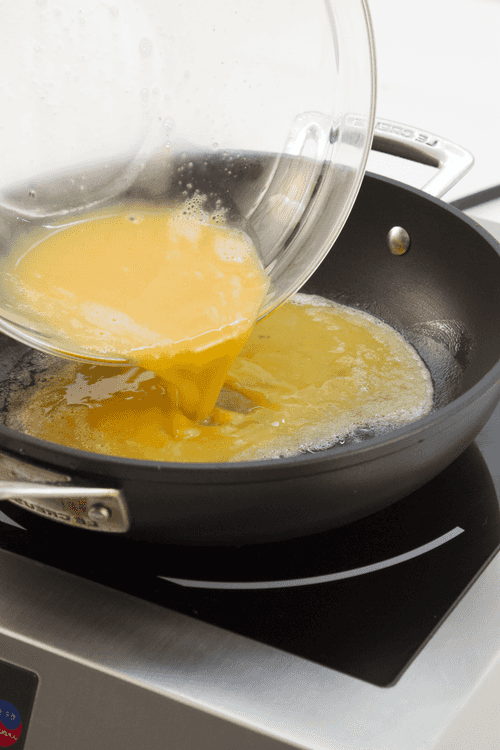 Melt butter in a pan. It's better to put the butter in a cold pan, as hot pans cause butter to smoke, turn brown, and become bitter quickly. It has a low burning temperature. Once the butter melts and starts to sizzle slightly, pour in the eggs with vodka and pepper, and fry until the egg mixture is firm yet slightly runny on top, while the edges and bottom are fully cooked, which can be checked by lifting the edge of the omelet with a spatula.