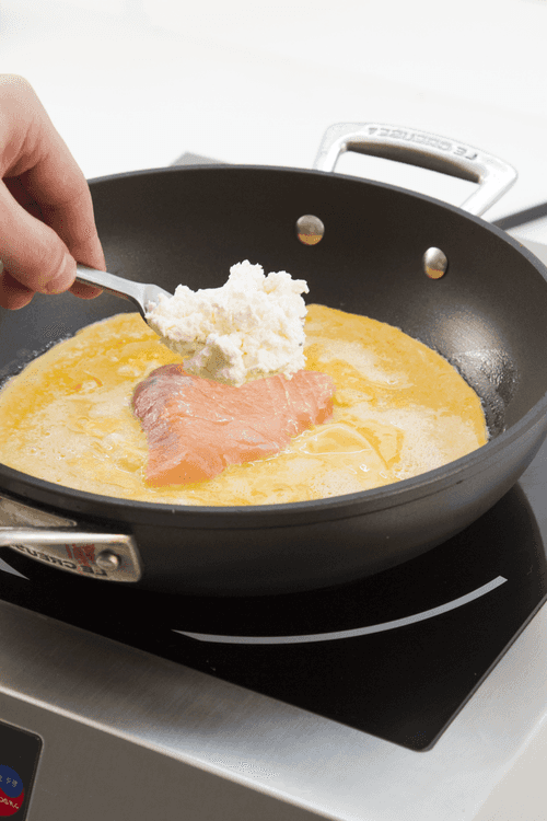 At this spot, you need to place slices of lightly salted salmon on the semi-liquid center of the omelet and spread cream cheese over the salmon.
