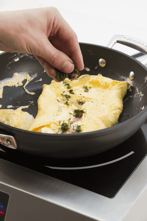 Sprinkle the omelet with chopped dill before serving. Serve with a cup of coffee.