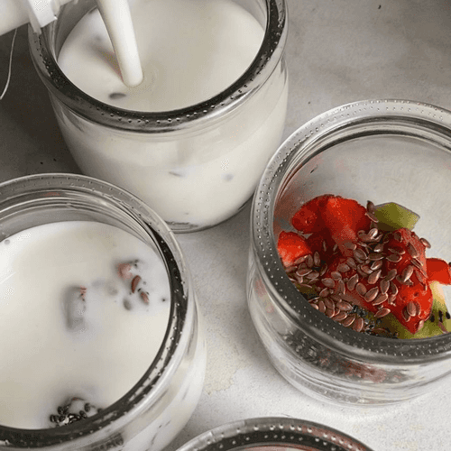 Lazy yogurt with chia seeds, flaxseeds, and fruits is a simple yet elegant dessert inspired by European healthy eating traditions. Its base is kefir, which enriches the body with beneficial probiotics. Chia and flaxseeds add texture and unique nutritional properties that aid digestion. Fruits like strawberries add fresh notes and light sweetness. This yogurt can be prepared in the evening and enjoyed in the morning as it acquires a delicate creamy consistency overnight. With its simplicity of preparation and healthy ingredients, it is perfect for breakfast or a light snack.
