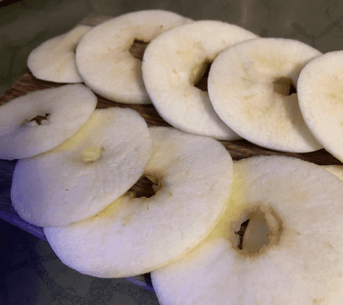 Slice into rings, but not too wide, as the apple should cook through. You can sprinkle with lemon, but it's optional.