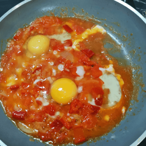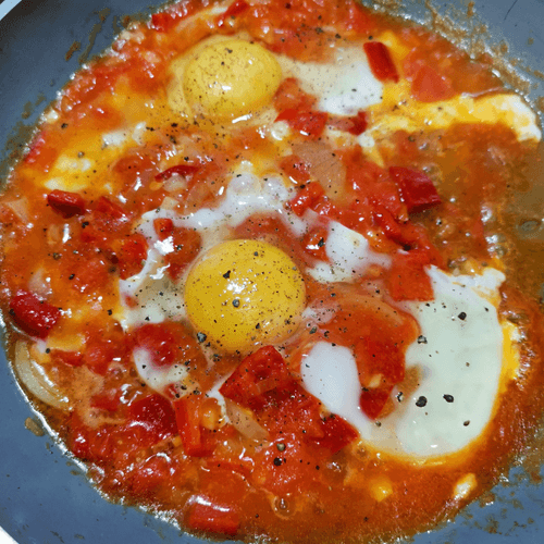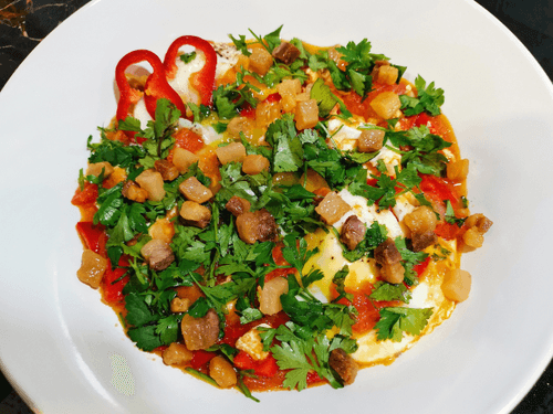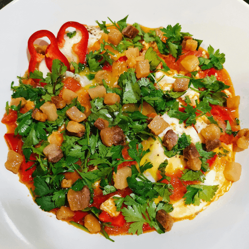 Яичница с салом и овощами — это сытное и ароматное блюдо, родившееся в домашней кухне как символ уюта и простоты. Обжаренные кусочки сала придают яичнице насыщенный вкус, их хрустящая текстура прекрасно сочетается с мягкостью яиц. Овощи — сочные помидоры, сладкий перец рамиро и душистый лук — добавляют свежесть и легкую кислинку, делая блюдо сбалансированным. Чеснок усиливает аромат, а свежая петрушка завершает композицию легкой пикантной ноткой. Эта яичница не просто завтрак — это полноценное блюдо, которое можно подать с ржаным хлебом или свежими овощами. Прекрасный выбор для тех, кто любит насыщенные вкусы и простые, но выразительные рецепты.