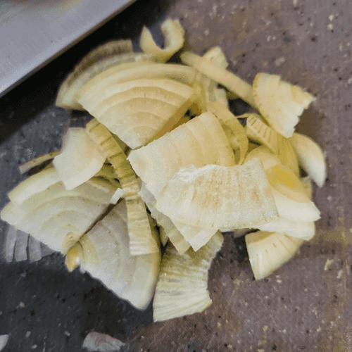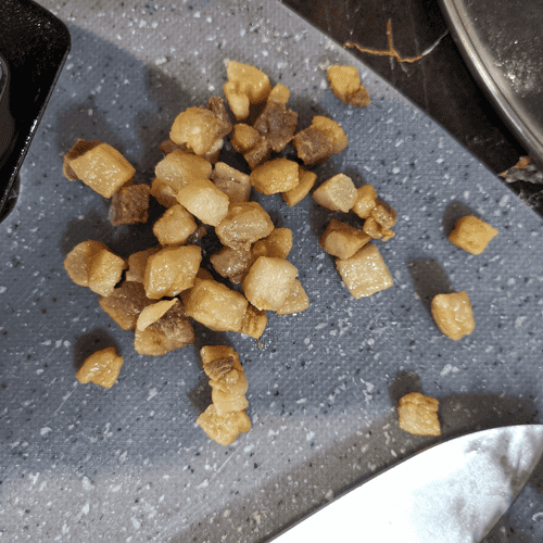 Cut the bacon into small cubes and send it to a dry hot skillet.