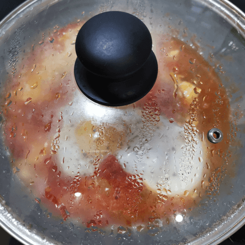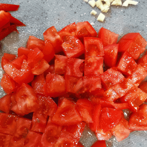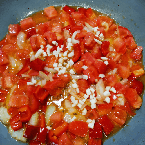 After 3 minutes, add tomato and onion, stir. Reduce heat to medium.