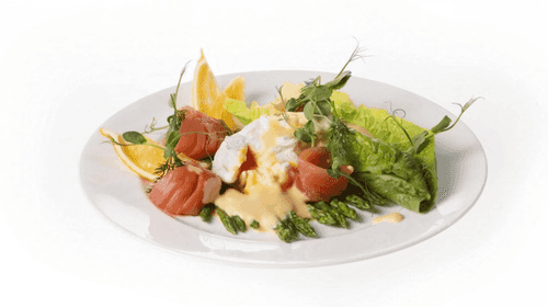 Place a romaine lettuce leaf on the plate. Next to it, arrange the dried asparagus. Next to that, place slices of salmon. Transfer the egg to the plate and drizzle with warm hollandaise sauce on top. Serve with 2 lemon wedges, dill, and pea sprouts.