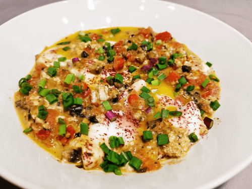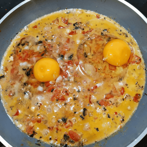 Eggs with feta and mushrooms is a refined combination of simplicity and rich flavor. This recipe creates a dish with the velvety texture of melted feta cheese that adds a pleasant saltiness. Complemented by aromatic Provençal herbs and the light acidity of fresh tomato, we achieve a gastronomic symphony. Mushrooms add an earthy note, deepening the flavor. Sumac gives an Eastern zest, while green onions refresh the overall composition. This dish is perfect for a cozy breakfast or a leisurely dinner. It is versatile—enjoy it alone or share with loved ones, complemented by toast or fresh vegetables. The author's approach makes it special by combining familiar ingredients in a new original sound.