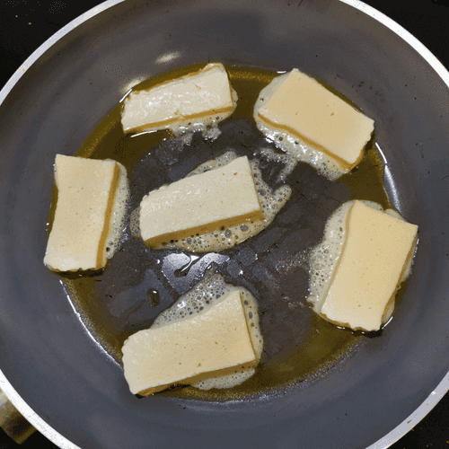 Place slices of cheese in the heated oil in the frying pan.