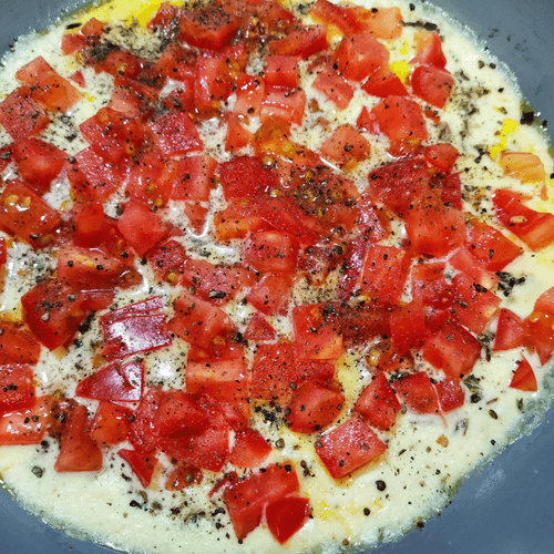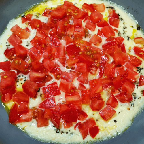 Once the cheese melts, add Provençal herbs and tomato. Reduce the heat to medium.