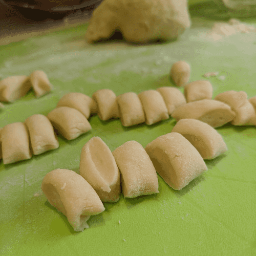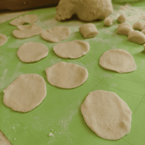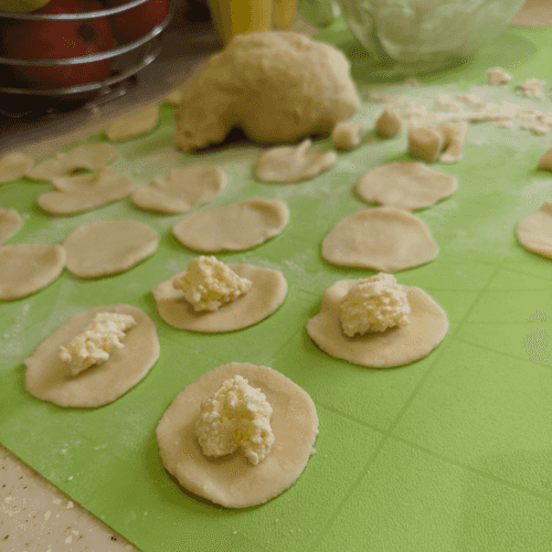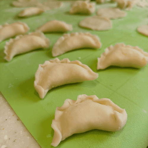 Pinch the edges of the dough. Drop the dumplings into boiling water for 1 minute.