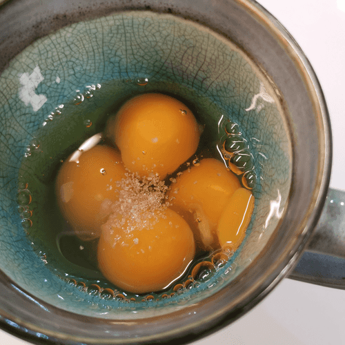Crack eggs into a mug and add salt.