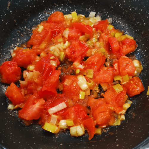 Fry the onion and tomato on high heat for 3 minutes, stirring occasionally.