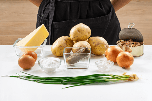Combine onion with potatoes, mix, add a little salt, and let it sit for 5 minutes.