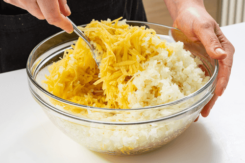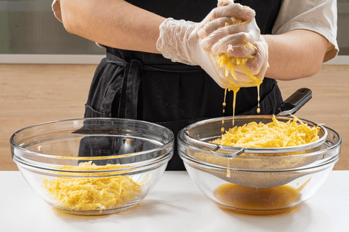 Place the vegetables in a colander and squeeze out as much water as possible. Then transfer to paper towels and squeeze again.
