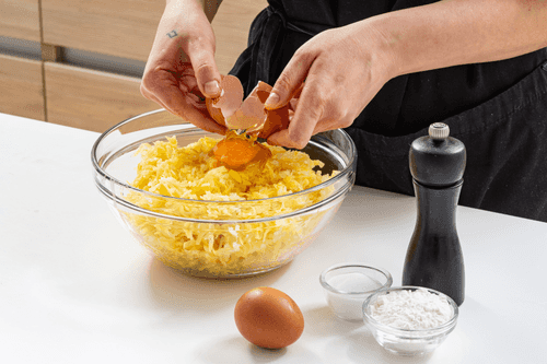Crack one egg into each potato, mix in rice flour, and season with salt and pepper.