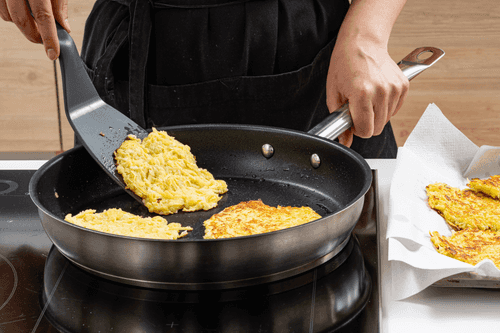 Heat vegetable oil in a pan and place potato pancakes with a tablespoon, pressing down with a spatula immediately. Fry for 2-3 minutes on each side. Transfer the finished pancakes to a folded kitchen towel to absorb excess fat.