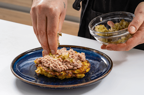 Place cod liver on the draniki, then add pickles.
