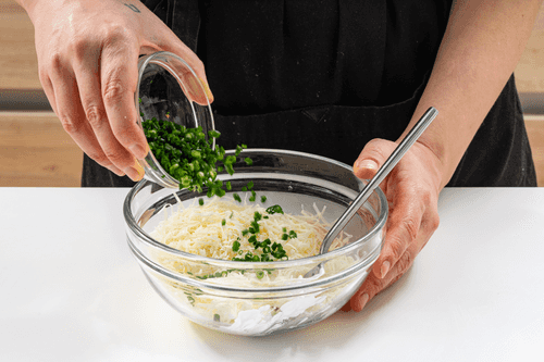 Chop the green onion finely, leaving a few sprigs for garnish. Mix with sour cream and grated cheese. Also, place it on the draniki.