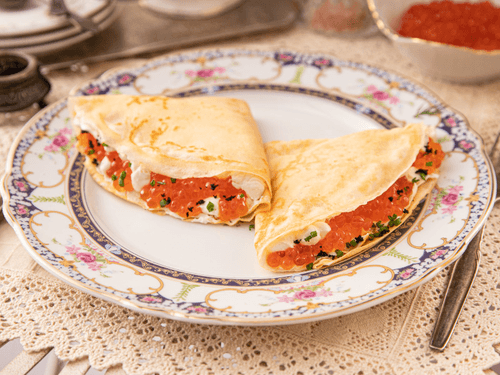 Place the pancakes on a plate, then spread red caviar around the edge of each.