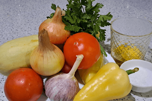 Prepare the necessary ingredients. Clean the vegetables and greens, wash them well under running water, and dry them.