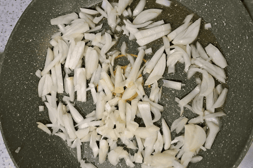 Place the onion in the pan and fry until golden brown.