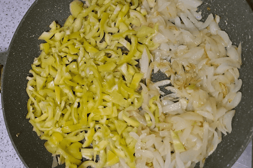 Cut the sweet pepper into strips and place it next to the onion.