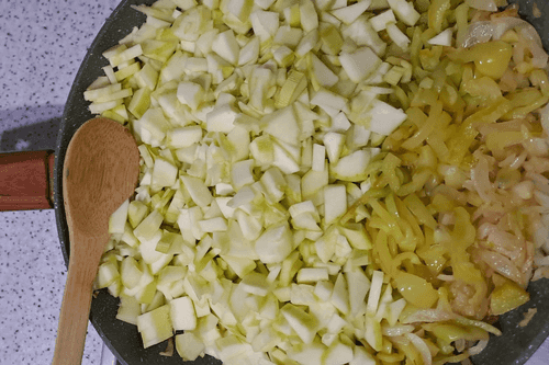 Cut young zucchini into cubes and place them in a pan. Fry over medium heat until cooked.
