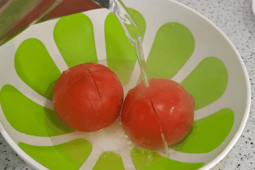 Place the tomatoes in a bowl and pour boiling water over them.