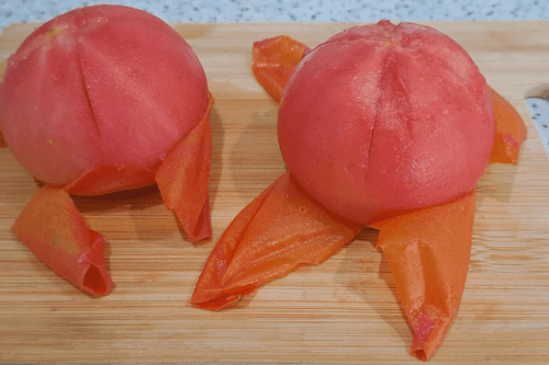 After 1 minute, place the tomatoes on a cutting board, let them cool slightly, and peel off the skin.