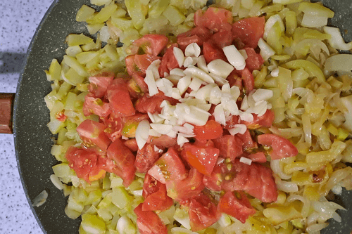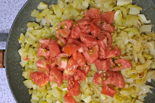 Cut the tomatoes into cubes and place them in the pan.