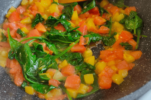 Add half of the cheese to the vegetables. Use the remaining cheese to make the second flatbread.