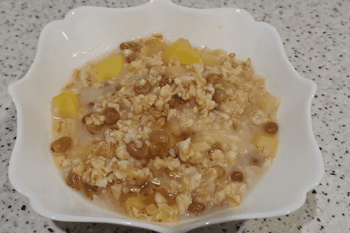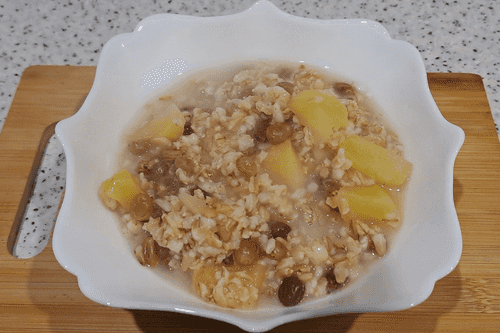 Serve the prepared oatmeal with apple and raisins.