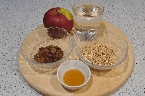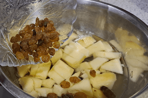 Place the prepared raisins in a container with boiling water and an apple.