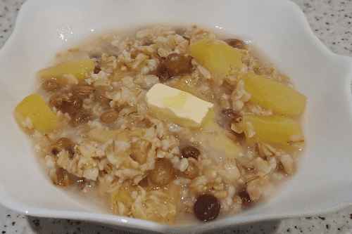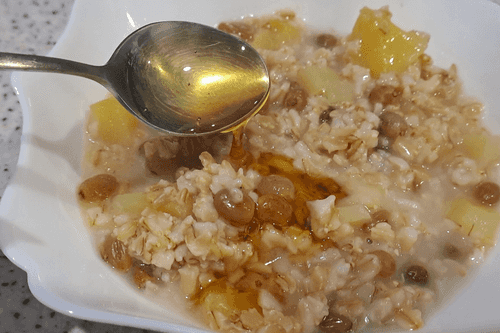 Oatmeal for breakfast with apple, raisins and honey