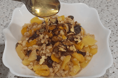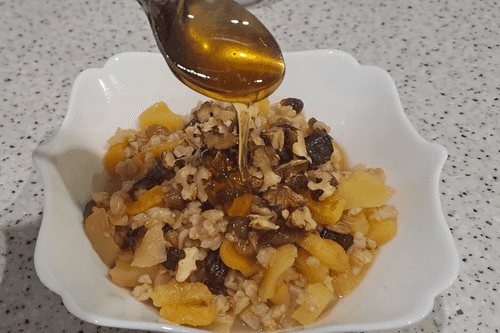 This breakfast is a true symphony of flavors and textures, where oatmeal serves as a gentle backdrop for the sweetness of dried fruits and the crunchiness of nuts. The dish is based on traditional European culinary principles, where natural ingredients create a harmony of taste and health benefits. Raisins, apricots, and dried cherries soak in hot water, filling with softness and depth of flavor, while the apple adds a fresh fruity note. Lightly toasted nuts release their aromatic oils, enriching the dish further. This breakfast not only warms and nourishes but also helps to start the day with ease and energy. It is especially suitable for those who appreciate the balance between sweet and healthy. The finishing touch is a spoonful of honey that adds natural sweetness and makes the porridge even cozier.