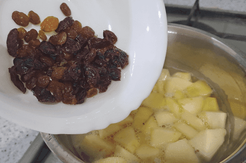 Rinse the raisins and dried cherries well under running water. Drain the water. Place the prepared raisins and dried cherries in a container with boiling water and an apple.