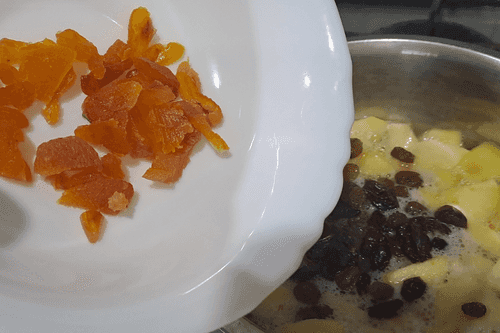 Wash the dried apricots under running water, cut into strips, and place in a container with apple, raisins, and cherries.
