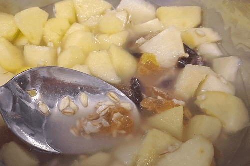 Oatmeal for breakfast with dried cherries, dried apricots, raisins and apple