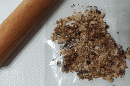 Place the roasted nuts in a bag and crush them with a rolling pin.