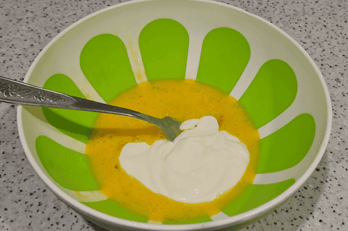 Add 100 grams of cottage cheese to the eggs and sour cream.
