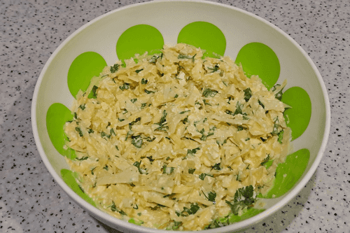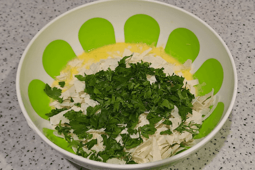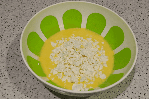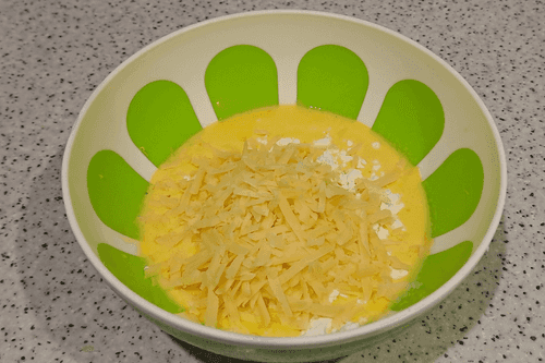 Grate the hard cheese on a coarse grater and add it to the bowl with eggs, sour cream, and cottage cheese. Mix all the ingredients well. Add salt to taste.