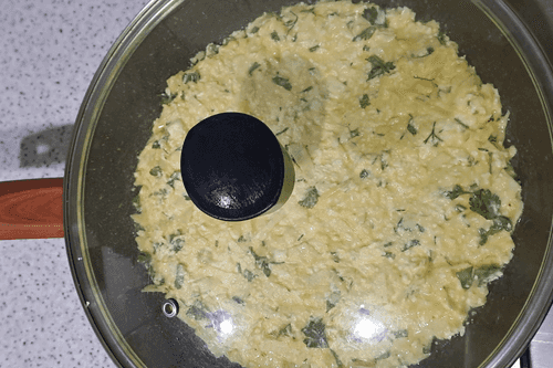 Use a plate or lid to flip the pancake in the pan to the other side and fry covered on medium heat for about 5-7 minutes.