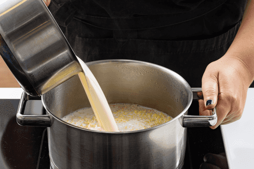 In a separate saucepan, bring the milk to a boil, pour it into the pot with the porridge, and add salt. Reduce the heat to low, cover with a lid, and cook until the porridge is fully cooked - about 30 minutes.