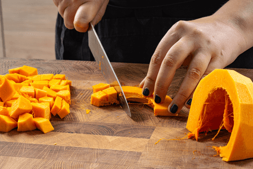 Peel the pumpkin from the skin and seeds, and cut it into cubes about 2 cm on each side.