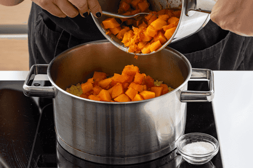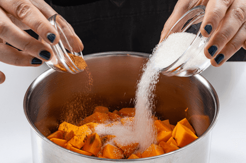 Place the pumpkin in a saucepan, add 30 g of sugar and cinnamon. Mix and let it sit for 15 minutes.