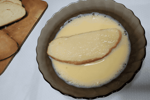 The bread slices should be well soaked in the egg mixture.