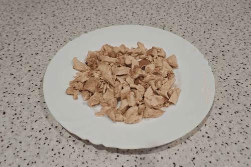 Boil the chicken thigh until cooked, cool it down, separate the meat from the bone, and cut it into cubes.