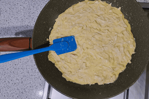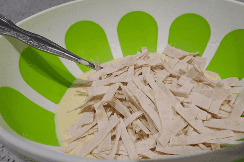 Cut the lavash into strips, then chop it with kitchen scissors. Mix the chopped lavash with the egg-sour cream mixture and let it sit for about 7-10 minutes.