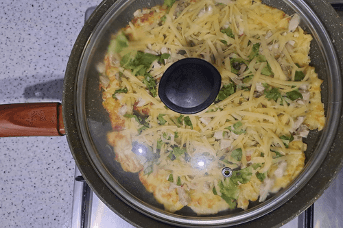 Use a plate or lid to flip the lavash to the other side. Place the chopped meat, greens, and grated cheese in the pan.