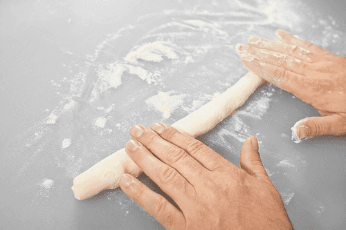 Sprinkle the table with a small amount of flour and place the cottage cheese mass. Divide into two equal parts and roll each into sausages of the same thickness.